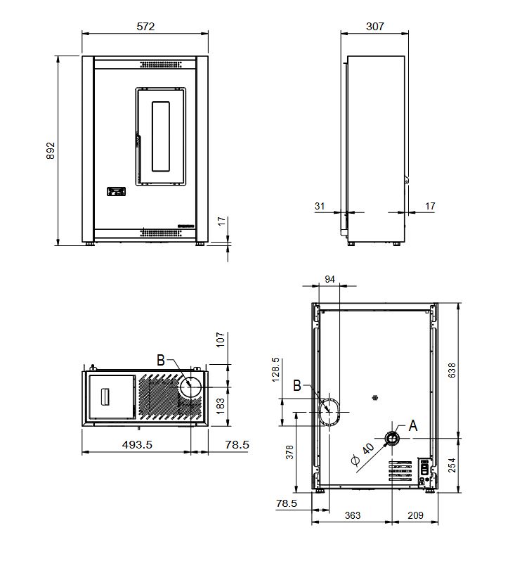 Cu o adâncime mai mică de 30 cm, Luisella este soba pe peleți ideală pentru a se potrivi chiar și în cele mai înguste spații ale casei tale, precum holurile sau coridoarele. Versatilitatea sa este completată de posibilitatea alegerii între evacuarea fumului pe verticală (superioară) sau pe orizontală (posterioară), pentru o instalare adaptată perfect cerințelor tale.